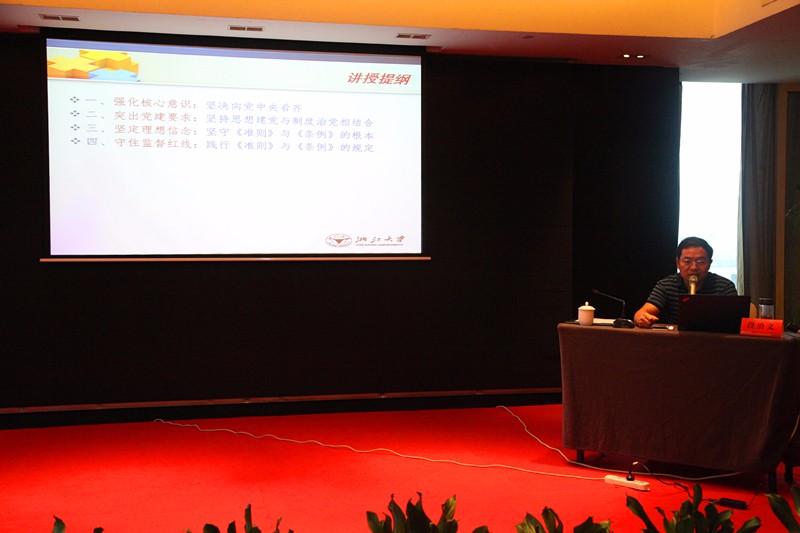 段治文教授從強化核心意識、突出黨建要求、堅定理想信念和守住監(jiān)督紅線四個方面生動細致地解讀了習近平總書記系列重要講話精神和治國理政新理念新思想新戰(zhàn)略。他首先提到,必須強化核心意識,即堅決向黨中央看齊?!耙粋€國家,一個政黨,領導核心至關重要”,為了推進全面從嚴治黨,需要一個核心領導者,而這個領導者就是習近平總書記。要理解習近平總書記治國理政新理念新思想新戰(zhàn)略,首先要從理解“中國夢”開始。所謂“中國夢”就是指實現(xiàn)中華民族的偉大復興。段治文說,一定要堅持思想建黨與制度治黨相結合。“紅船精神”是中國共產黨建黨過程中首創(chuàng)、奮斗、奉獻精神的象征,更是黨與人民關系的有力體現(xiàn),學習和弘揚“紅船精神”就是思想建黨;完善規(guī)范、健全制度、扎緊制度籠子,則是解決矛盾與問題的要點,學習和牢守黨章黨規(guī)就是制度治黨。段教授強調,共產黨員要堅守《準則》與《條例》的規(guī)定,絕不做腳踩紅線、失掉底線的事。