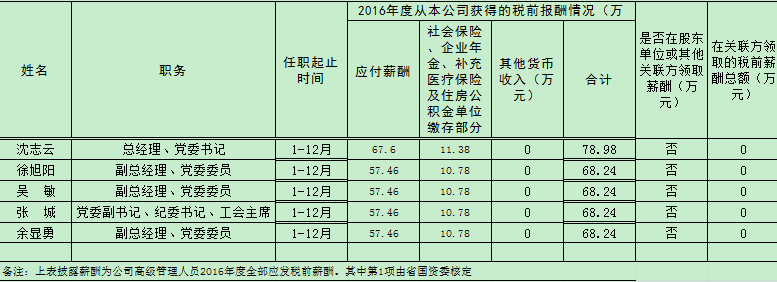 浙江省二輕集團公司高級管理人員2016年度薪酬情況